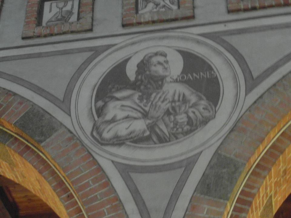 Po ja prisikėlęs Jėzus mandorlėje, iš šonų apaštalų šv. Petro ir šv. Pauliaus figūros. Po Jėzaus kojomis įtaisytas kartušas su įrašu „Pax vobis“ – „Ramybė jums“. Tas užrašas turėjo didelės reikšmės, atsižvelgiant į tai, kad bažnyčia buvo tapoma pačiame karo įkarštyje. Taigi, jis teikė žmonėms nusiraminimo ir paguodos. Ties arkos pėda – medalionai su šv. Jono Krikštytojo (kairėje) ir šv. Juozapo (dešinėje) pusfigūrėmis. Visas bažnyčios sienas dengia vientisas, visas sienas užpildantis dekoras. Presbiterijos sienas dengia kristogramos motyvas, pasikartojančių kviečių varpų ir vynuogių kekių motyvai (tai Eucharistijos simbolis). Apsidės skliaute vėlgi kristogramos motyvas ir angelų figūros, kurios šlovina Viešpatį. O pačiame viršuje patalpinta Apvaizdos akis. Centrinės navos šoninėse sienose pavaizduoti apaštalai. Galeriją remia arkos, kurių tarpuose įterpti medalionai su evangelistų pusfigūrėmis. Medalionai su lituanistiniais motyvais – šv. Juozapato Kuncevičiaus ir šv. Kazimiero atvaizdais – yra vargonų tribūną remiančios arkados šonuose.