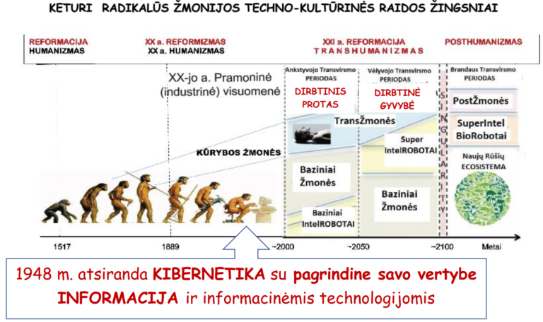 Apibendrinta XVI-XXI-jo amžių Žmonijos techno-kultūrinės raidos tendencijos – keturi radikalūs socialinės evoliucijos žingsniai (pagal D. Kirvelis, 2017)